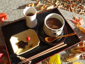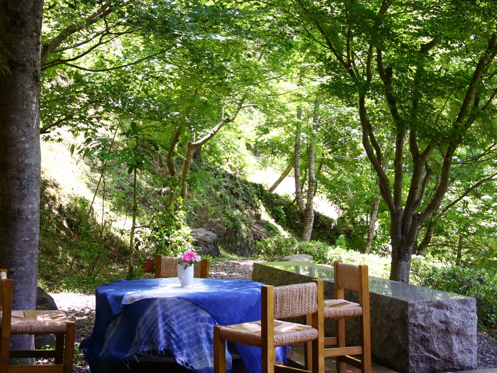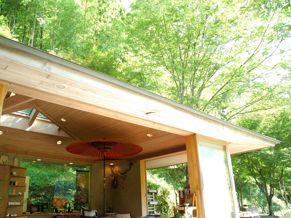 古今伝授の里フィールドミュージアムの施設の中で、もっとも高く、眺望のよい場所にある茶屋は、新緑と紅葉の隠れた名所。茶屋を覆うように植えられたケヤキやモミジの鮮やかな紅葉が、昼下がりの温かな陽射しを浴びるといっそう艶やかになるようです。