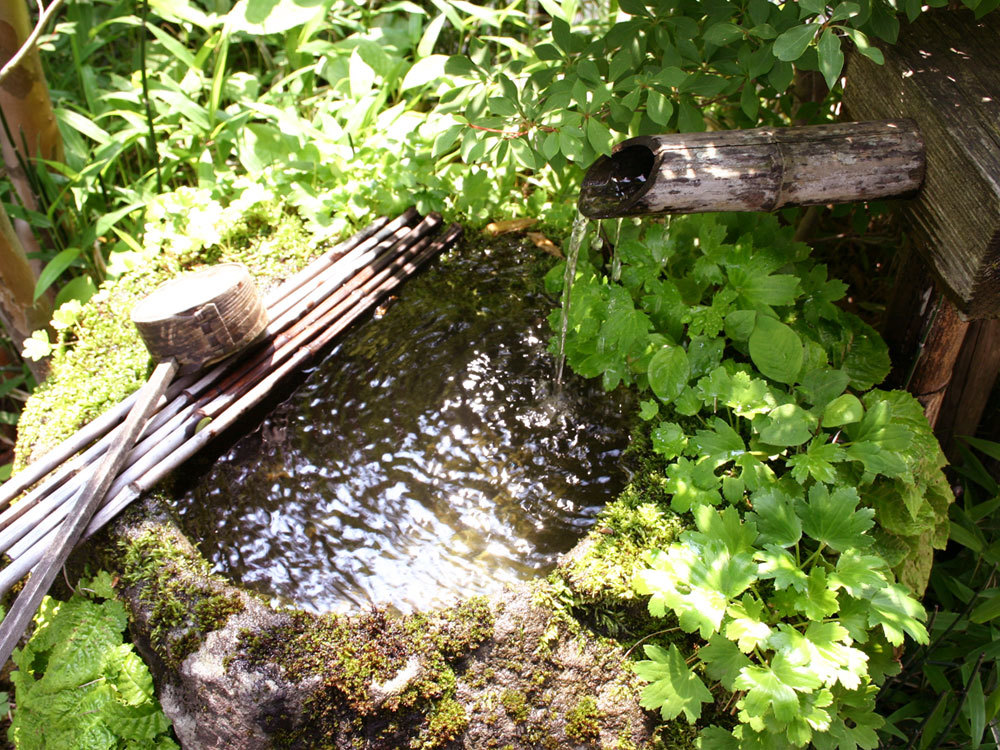 床の間の飾りは、ガラス越しの紅葉や梅の花というように、季節により室内の風景が変わります。また、濡れ縁に立てば、眼前の池に映りこんだ篠脇山、水面に反射し軒天に映る水蜻蛉を愛でることができます。